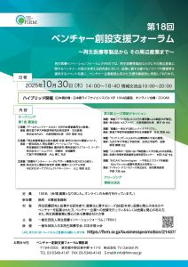 一般社団法人再生医療イノベーションフォーラム (FIRM) が主催する「第18回 ベンチャー創設支援フォーラム」にて、演題「再生医療等製品の海外展開(米国、欧州)に向けた調査について」と題し、同 特定細胞加工物等委員会 臨床研究・開発促進タスクフォース リーダー を務める、当社取締役 技術顧問 片山博仁 が講演いたします。